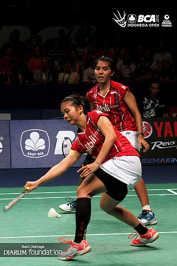 Greysia Polii/Nitya Krishinda (Indonesia) gagal menghadang serangan yang dilepaskan Tang Jinhua/Tian Qing (China)