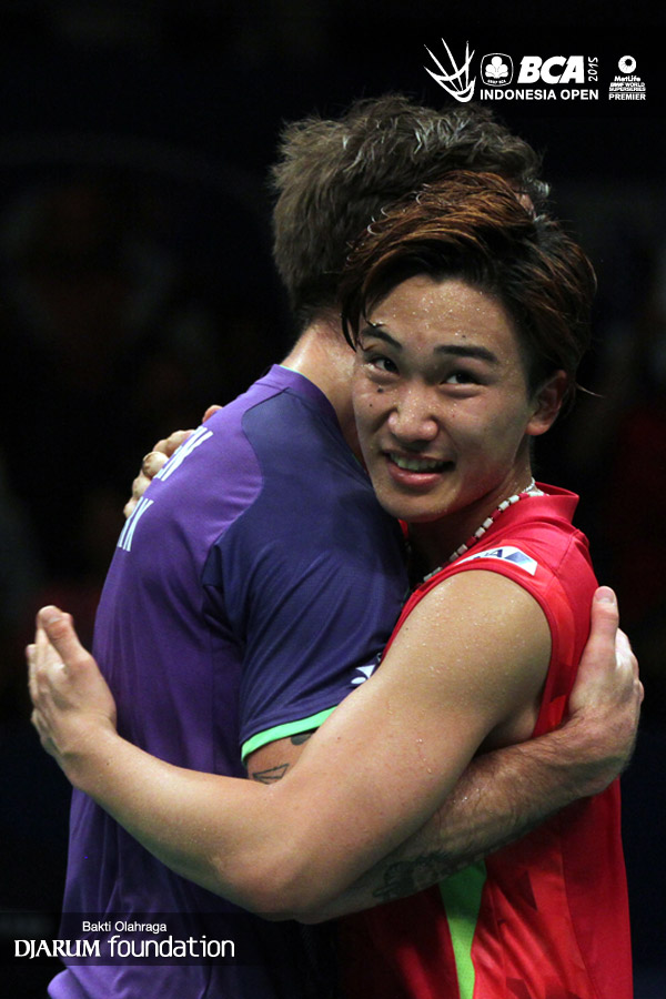 Jan O Jorgensen (Denmark) dan Kento Momota (Jepang) saling berpelukan usai bertanding