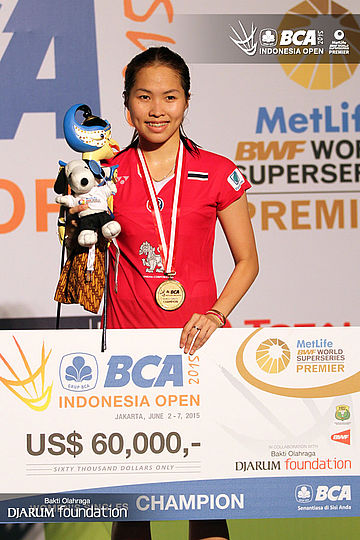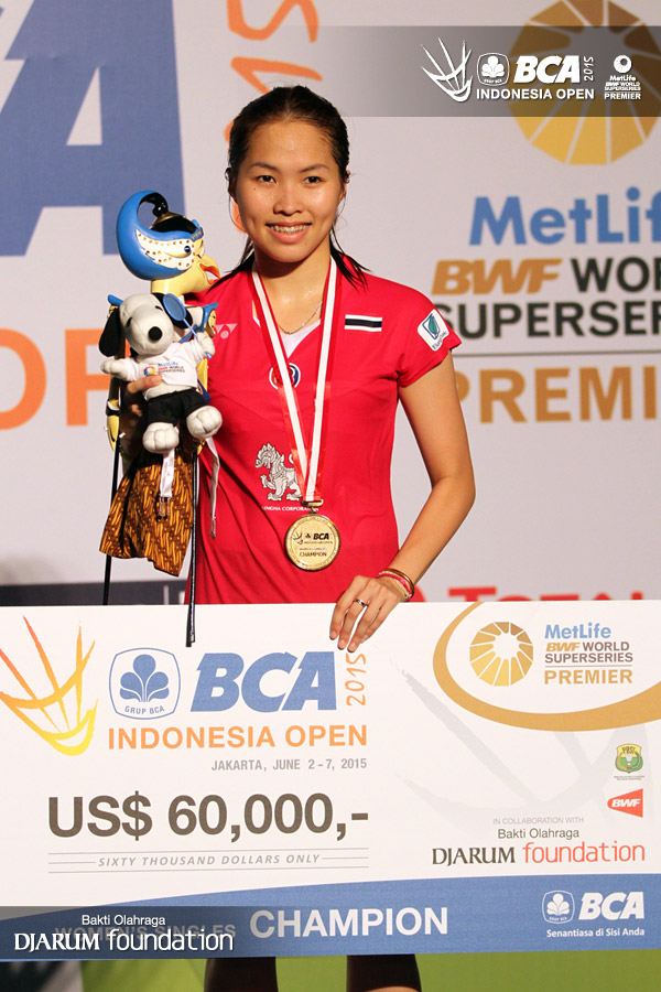 Yui Hashimoto (Jepang) dan Ratchanok Intanon (Thailand) saat di podium juara