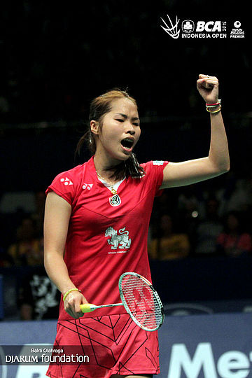 Ratchanok Intanon (Thailand) terjatuh saat berusaha mengembalikan shuttlecock