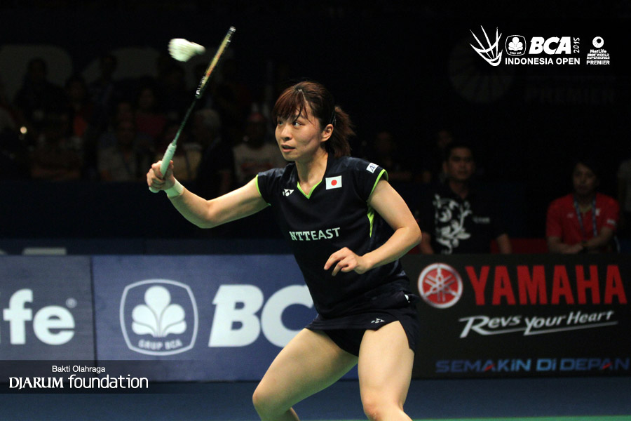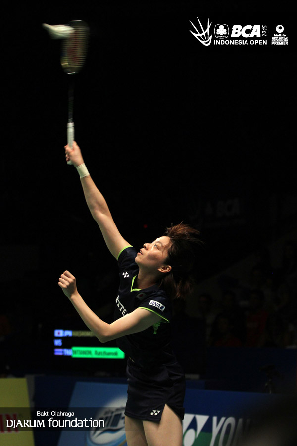 Yui Hashimoto (Jepang) melepaskan serangan ke arah Ratchanok Intanon (Thailand)