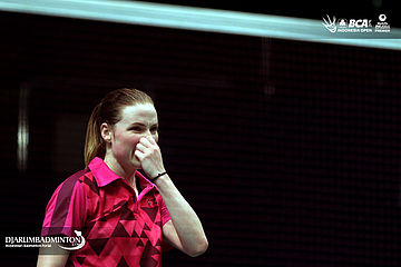 Ekspresi Kamilla Rytter Juhl (Denmark) saat berlatih