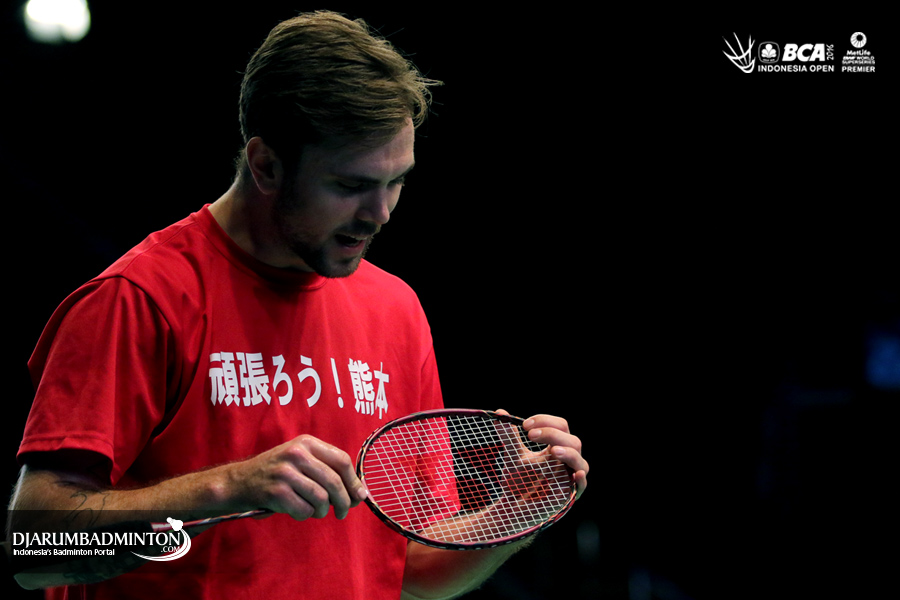 Jan O Jorgensen (Denmark) memeriksa raketnya setelah berbenturan