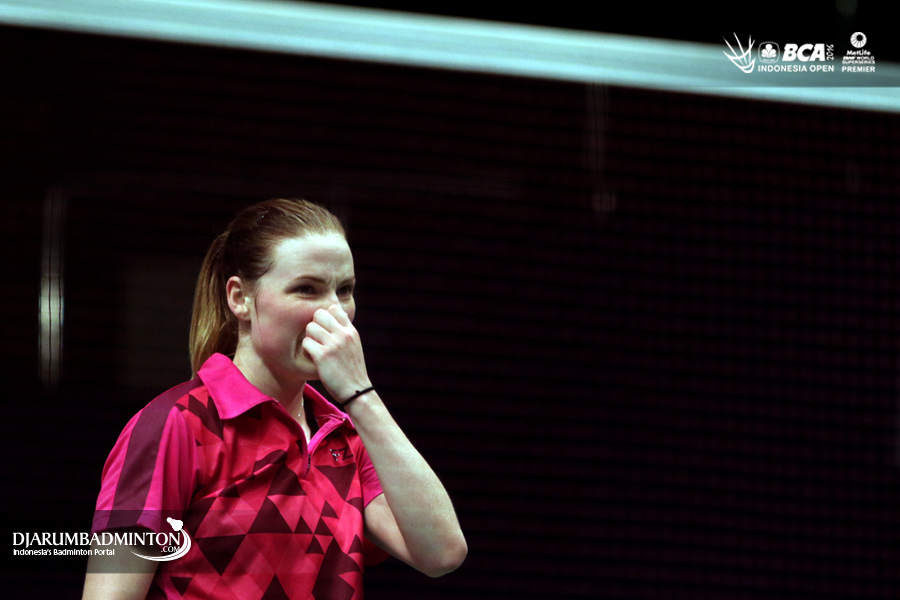Ekspresi Kamilla Rytter Juhl (Denmark) mengikat tali sepatunya