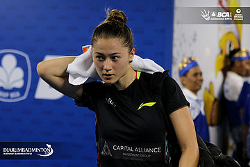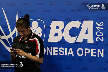 Jauza Fadilah Sugiarto (Indonesia) bermain handphone setelah bertanding