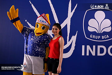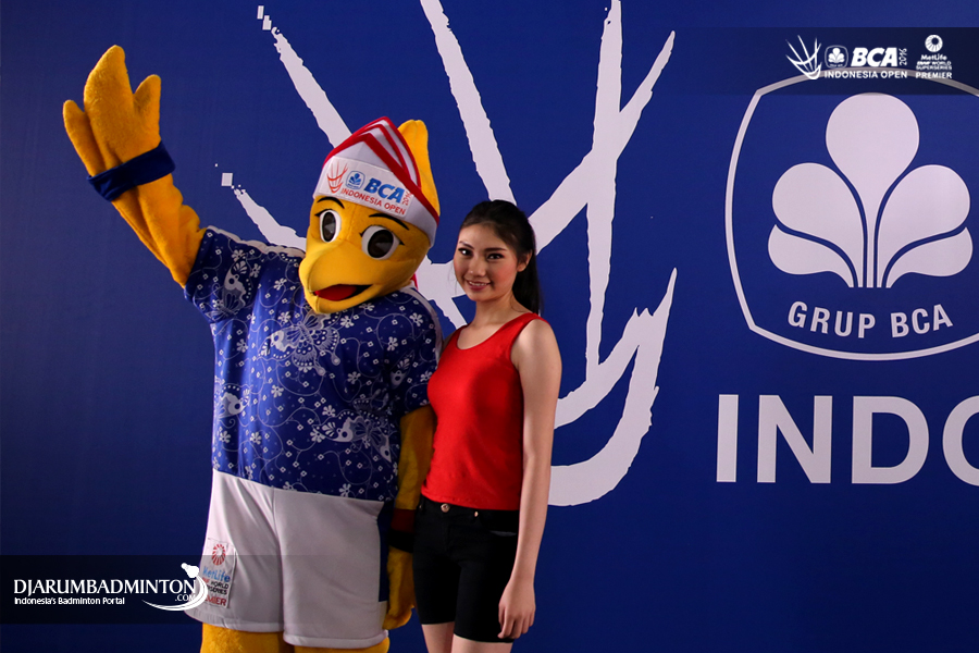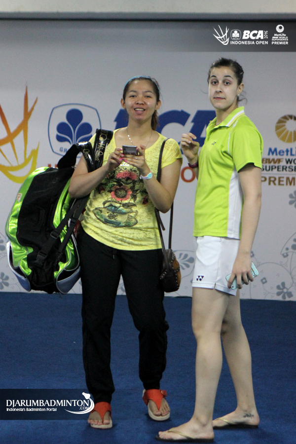 Febby Angguni (Indonesia) dan Carolina Marin (Spain) berpose di player gate