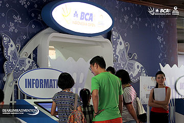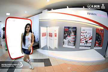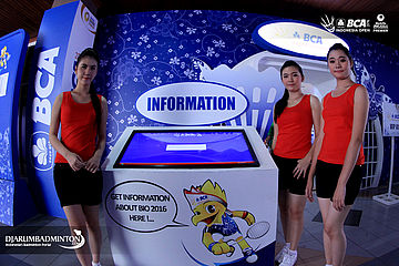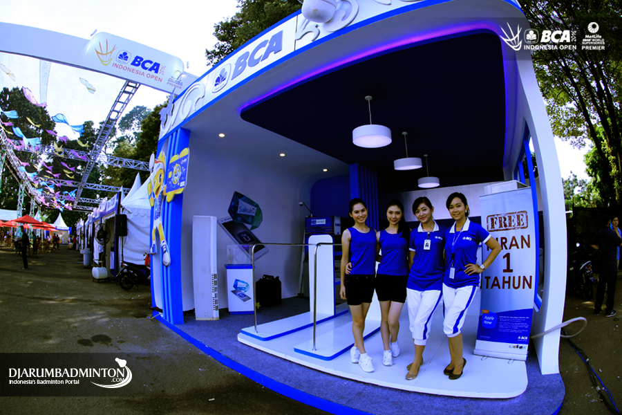 Para usher sedang berpose di booth BCA dalam gelaran BCA Indonesia Open Super Series Premier 2016