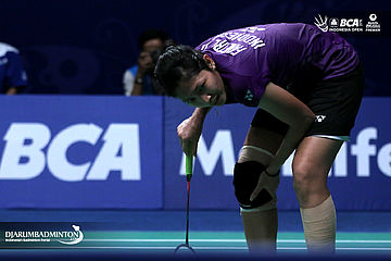 Wang Yihan (Tiongkok) terjatuh saat berusaha mengembalikan shuttlecock