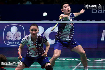 Liu Cheng/Bao Yixin (Tiongkok) mengembalikan shuttlecock