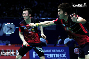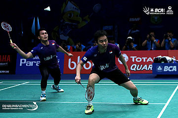 Hendra Setiawan/Mohammad Ahsan (Indonesia) bersiap menghadang serangan