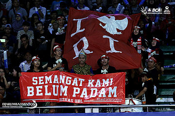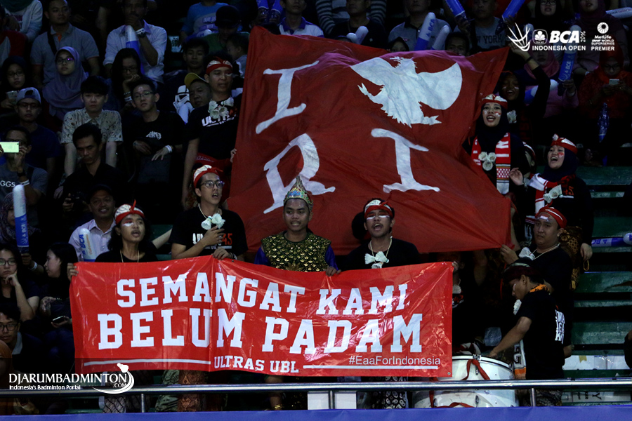 Pendukung fanatik bulutangkis memberikan dukungan kepada para atlet Indonesia yang sedang bertanding di BCA Indonesia Open Super Series Premier 2016