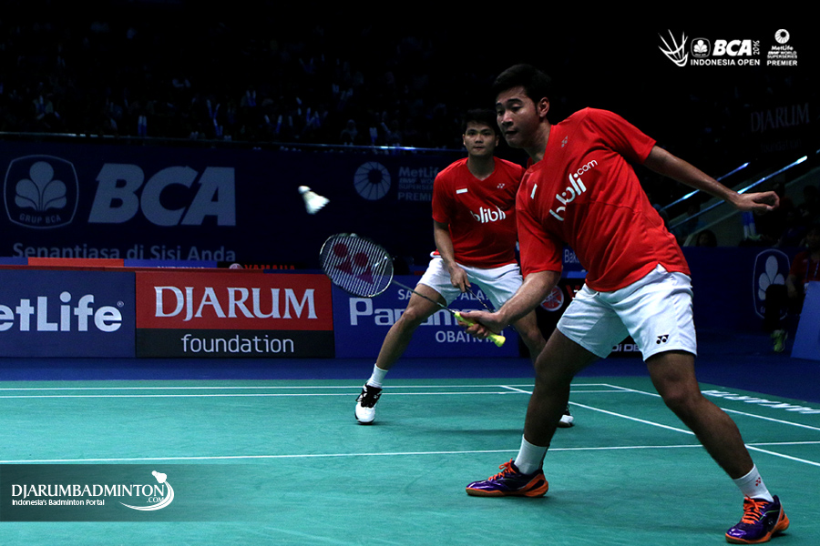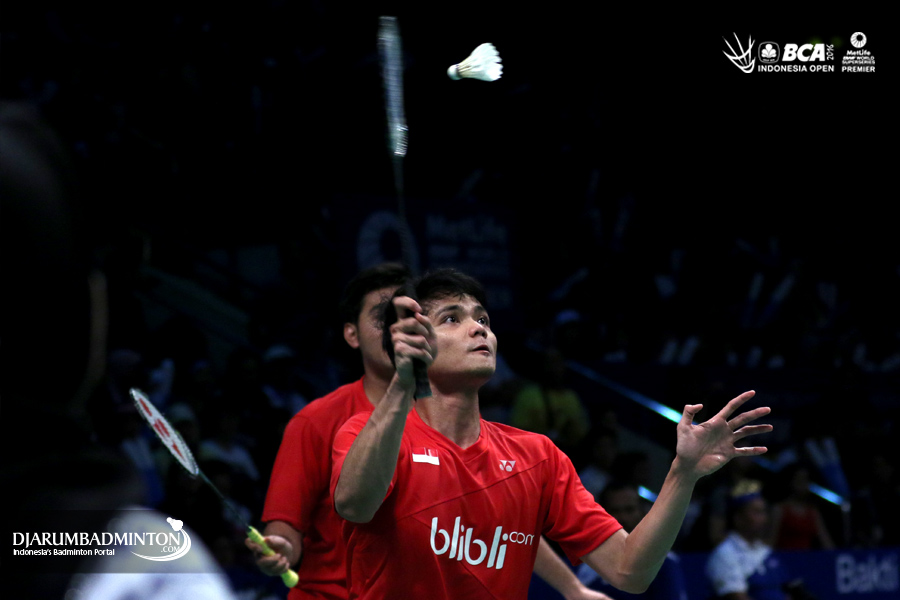 Angga Pratama/Ricky Karanda (Indonesia) menghadang serangan