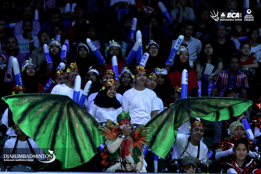 Pendukung fanatik bulutangkis memberikan dukungan kepada para atlet Indonesia yang sedang bertanding di BCA Indonesia Open Super Series Premier 2016