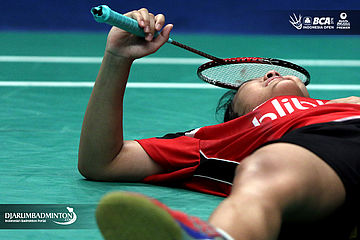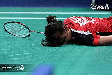 Agatha Imanuela (Indonesia) terjatuh saat berusaha mengembalikan shuttlecock