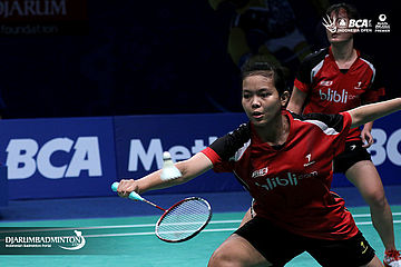 Agatha Imanuela/Siti Fadia (Indonesia) mengembalikan shuttlecock
