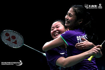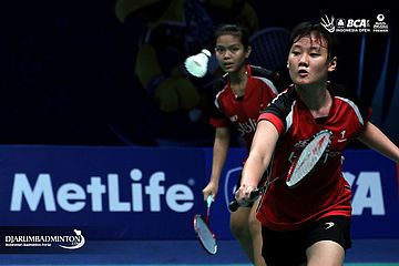 Agatha Imanuela/Siti Fadia (Indonesia) menghadang serangan