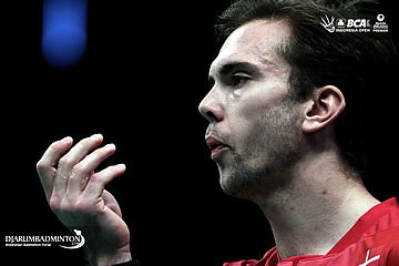 Jan O Jorgensen (Denmark) mengembalikan shuttlecock
