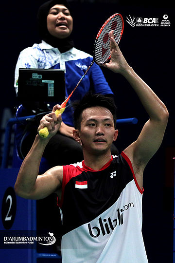 Ihsan Maulana Mustofa (Indonesia) mengembalikan shuttlecock
