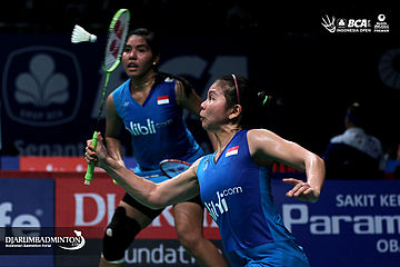 Greysia Polii/Nitya Krishina Maheswari (Indonesia) menghadang serangan