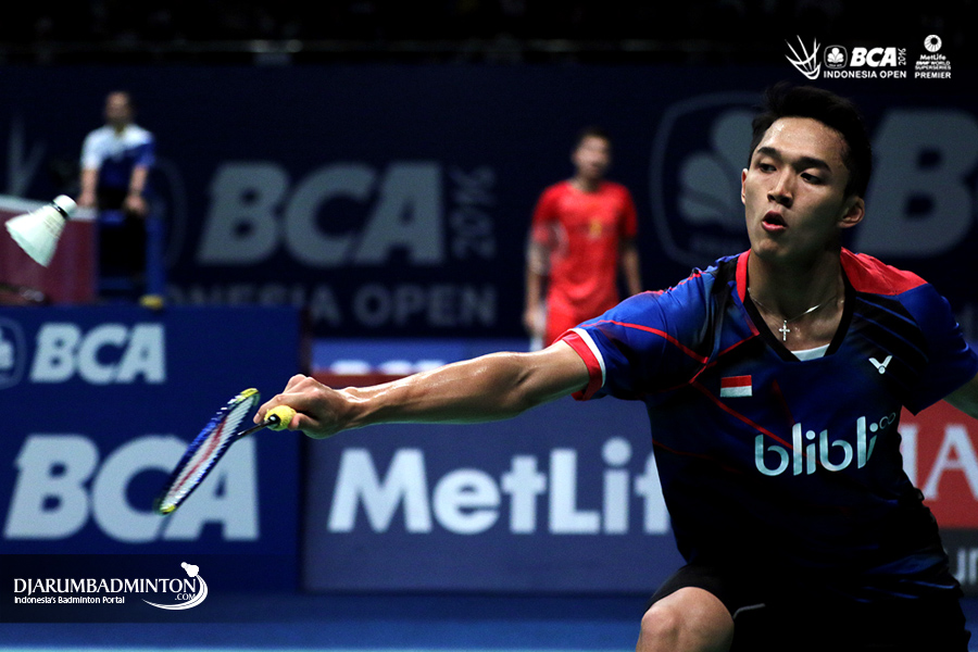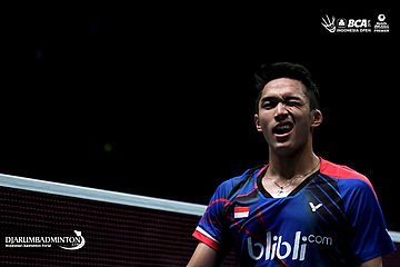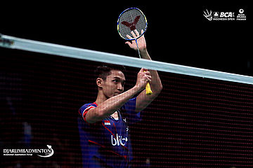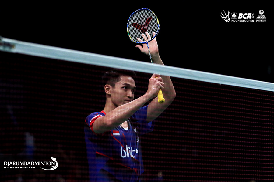 Jonathan Christie (Indonesia) memberikan apresiasi kepada seluruh supporter yang memenuhi Istora, Senayan Jakarta