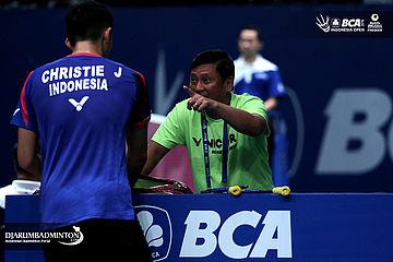 Pelatih tunggal putra Indonesia, Hendry Saputra saat memberikan intruksi kepada Jonathan Christie (Indonesia)