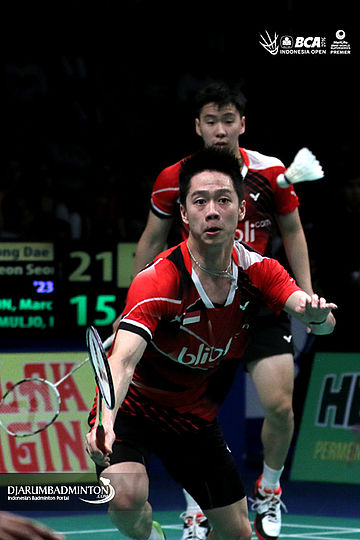 Kevin Sanjaya/Markus Fernaldi Gideon (Indonesia) berusaha mengapai pengembalian