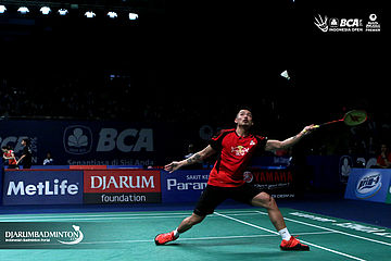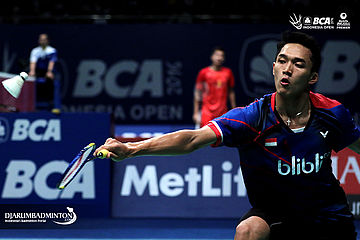 Jonathan Christie (Indonesia) mengembalikan shuttlecock