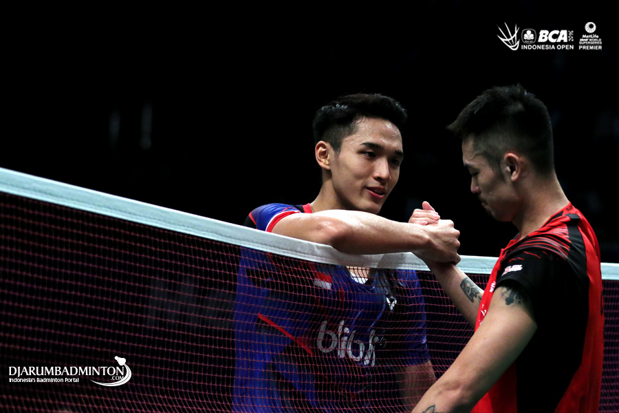 Jonatha Christie (Indonesia) bersalaman dengan Lin Dan (Tiongkok) usai bertanding