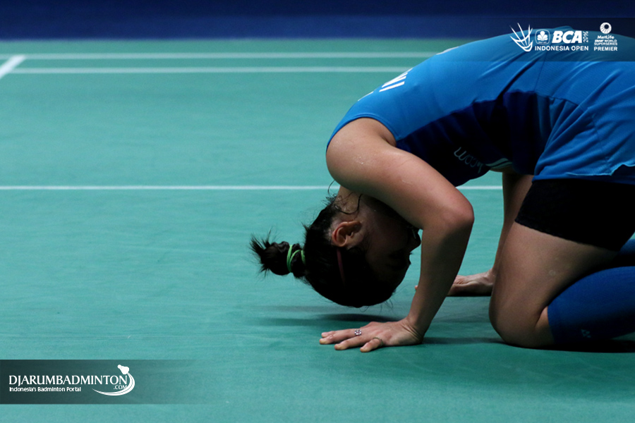 Ekspresi Greysia Polii (Indonesia) saat kehilangan poin