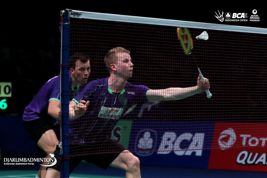 Anders Skaarupasmunssen/Kim Astrup (Denmark) bersiap menghadang serangan