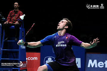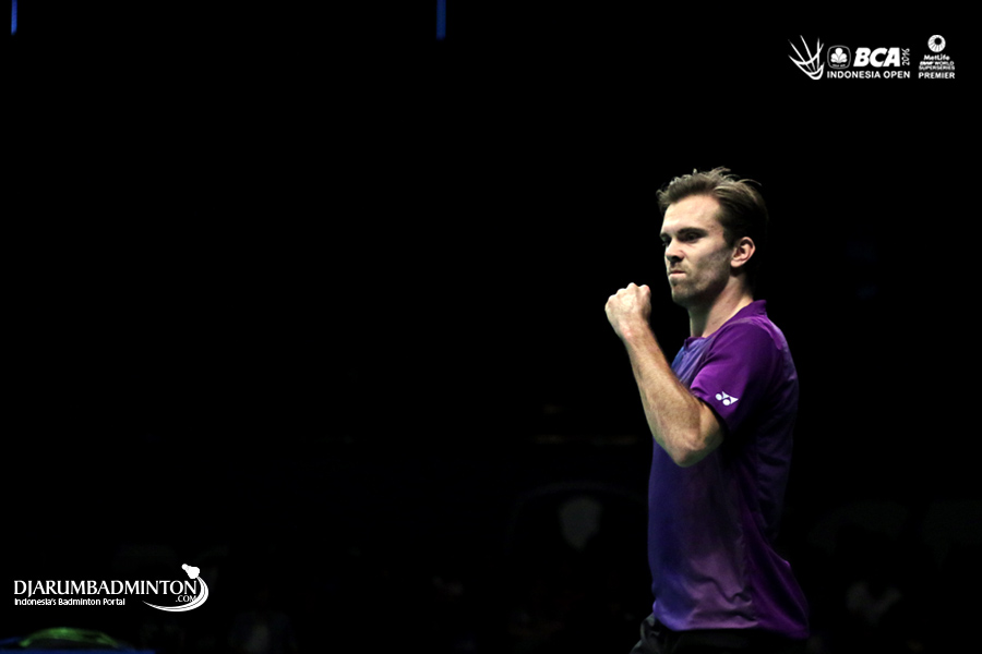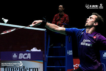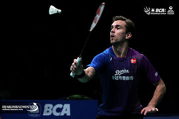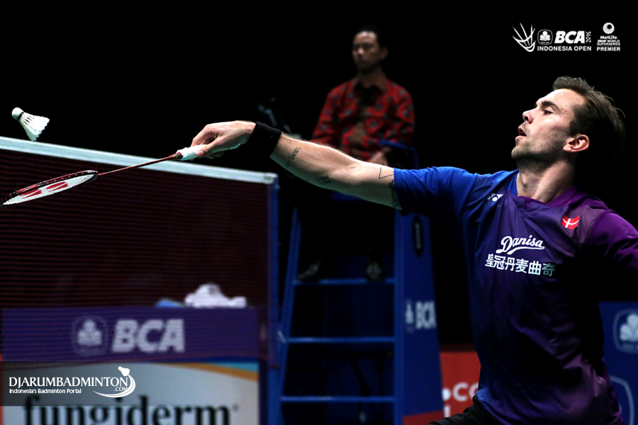 Jan O JOrgensen (Denmark) mengembalikan shuttlecock
