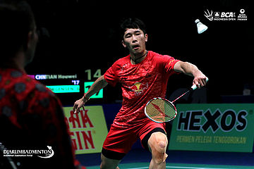 Tian Houwei (Tiongkok) mengembalikan shuttlecock