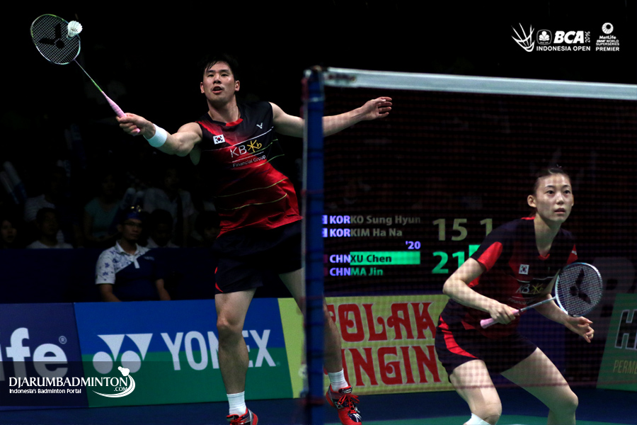 Ko Sung Hyun/Kim Ha Na (Korea) mengembalikan shuttlecock