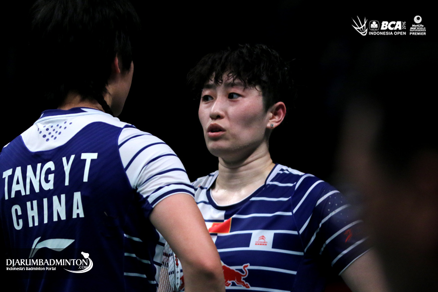 Tang Yuanting/Yu Yang (Tiongkok) saling berkomunikasi di lapangan