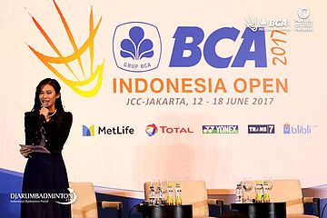 MC saat membuka acara press conference BCA Indonesia Open Superseries Premier 2017