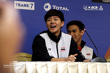 Sapsiree Taerattanachai (Thailand) menjawab pertanyaan dengan bergurau di Press Conference BCA Indonesia Open Superseries Premier 2017