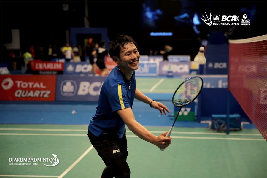 Ekspresi Keigo Sonoda (Jepang) saat mengembalikan shuttlecock di sela sela latihan
