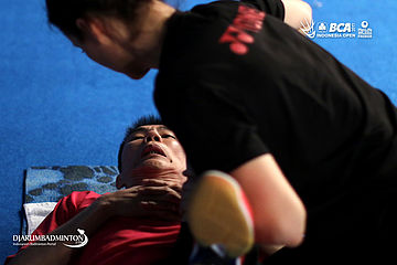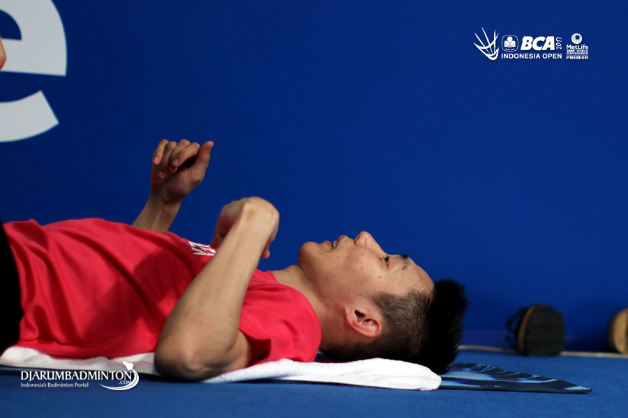Lee Chong Wei (Malaysia) berbaring di sisi lapangan usai berlatih