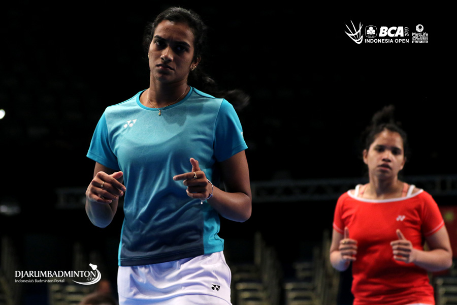 PV Sindhu (India) saat melakukan pemanasan sebelum memulai latihan