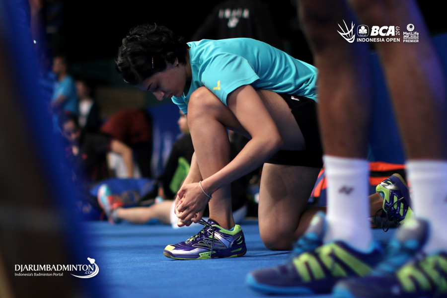 Ashwini Ponnappa (India) mengikat tali sepatu sebelum memulai latihan