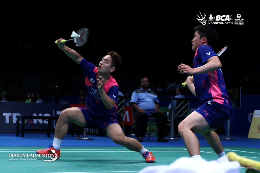 Choi Solgyu/Kim Dukyoung (Korea) menghadang serangan.