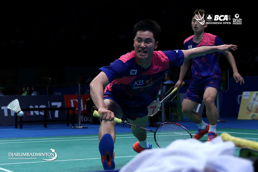 Choi Solgyu/Kim Dukyoung (Korea) berusaha menggapai pengembalian.