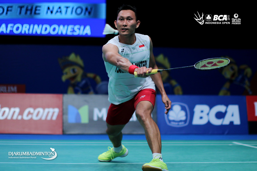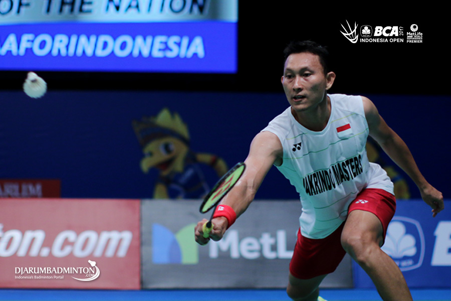 Sony Dwi Kuncoro (Indonesia) mengembalikan shuttlecock
