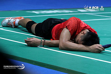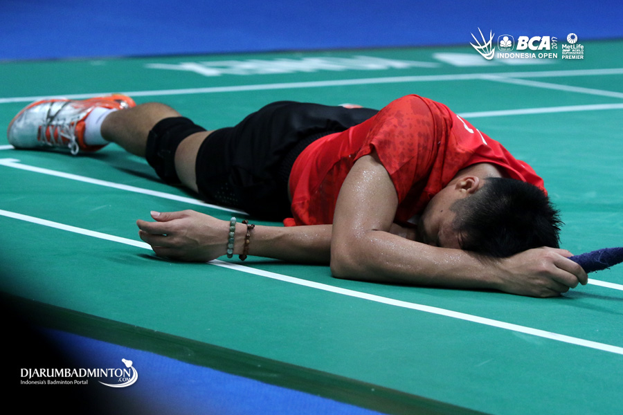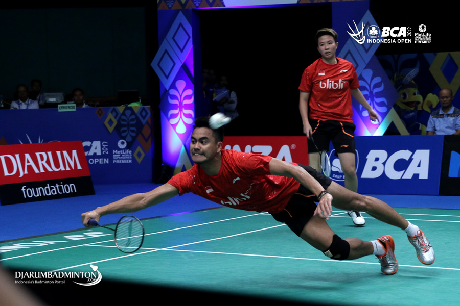 Tontowi Ahmad (Indonesia) harus terjatuh saat berusaha menghadang serangan