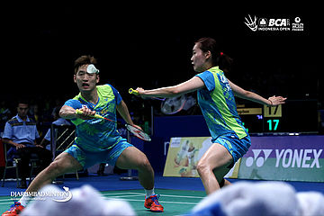 Tontowi Ahmad/Liliyana Natsir (Indonesia) mengembalikan shuttlecock