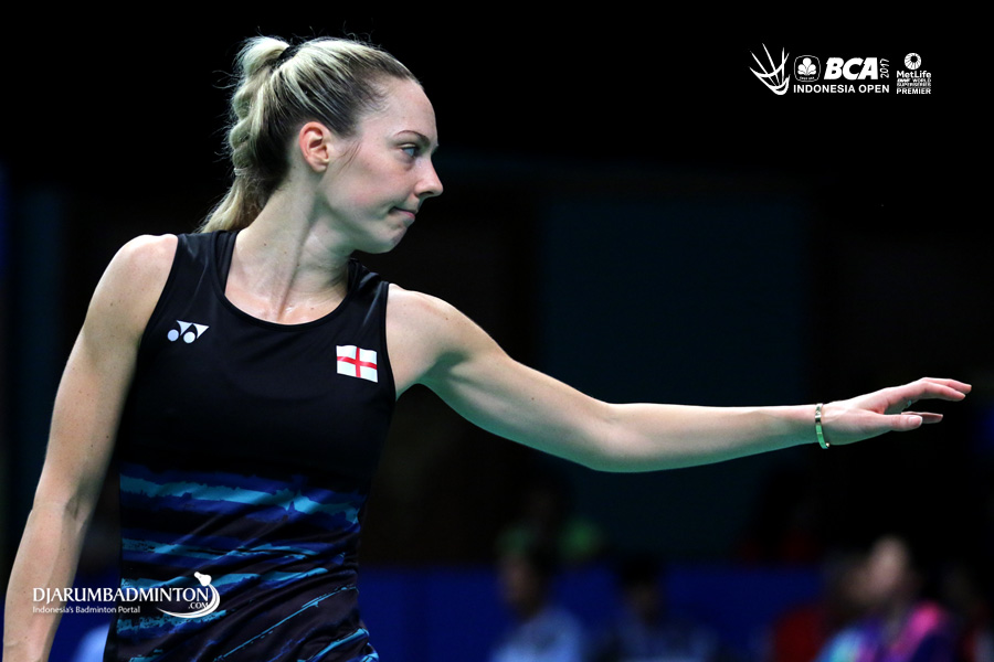 Gabrielle Adcock (Inggris) bersiap menerima serve