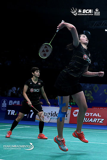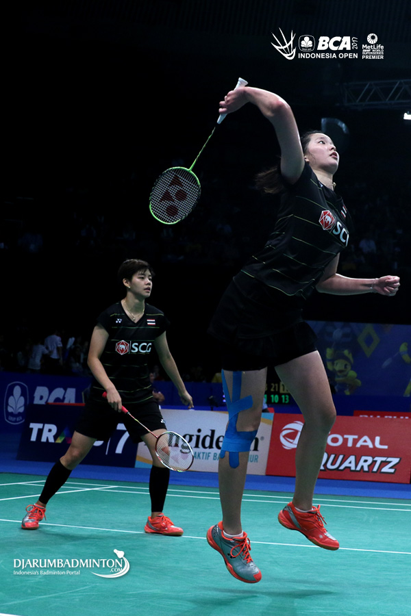 Puttita Supajirakul/Sapsiree Taerattanachai (Thailand) bersiap menyambar pengembalian tanggung