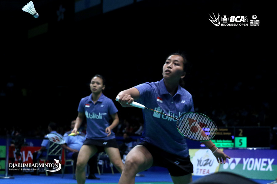 Della Destiara Haris/Rosyita Eka Putri Sari (Indonesia) bersiap menghadang serangan