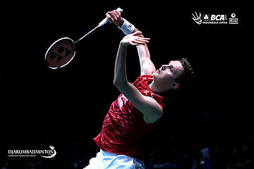 Viktor Axelsen (Denmark) melepaskan smash