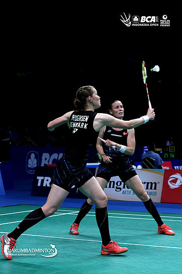 Christinna Pedersen/Kamilla Rytter Juhl (Denmark) mengembalikan shuttlecock